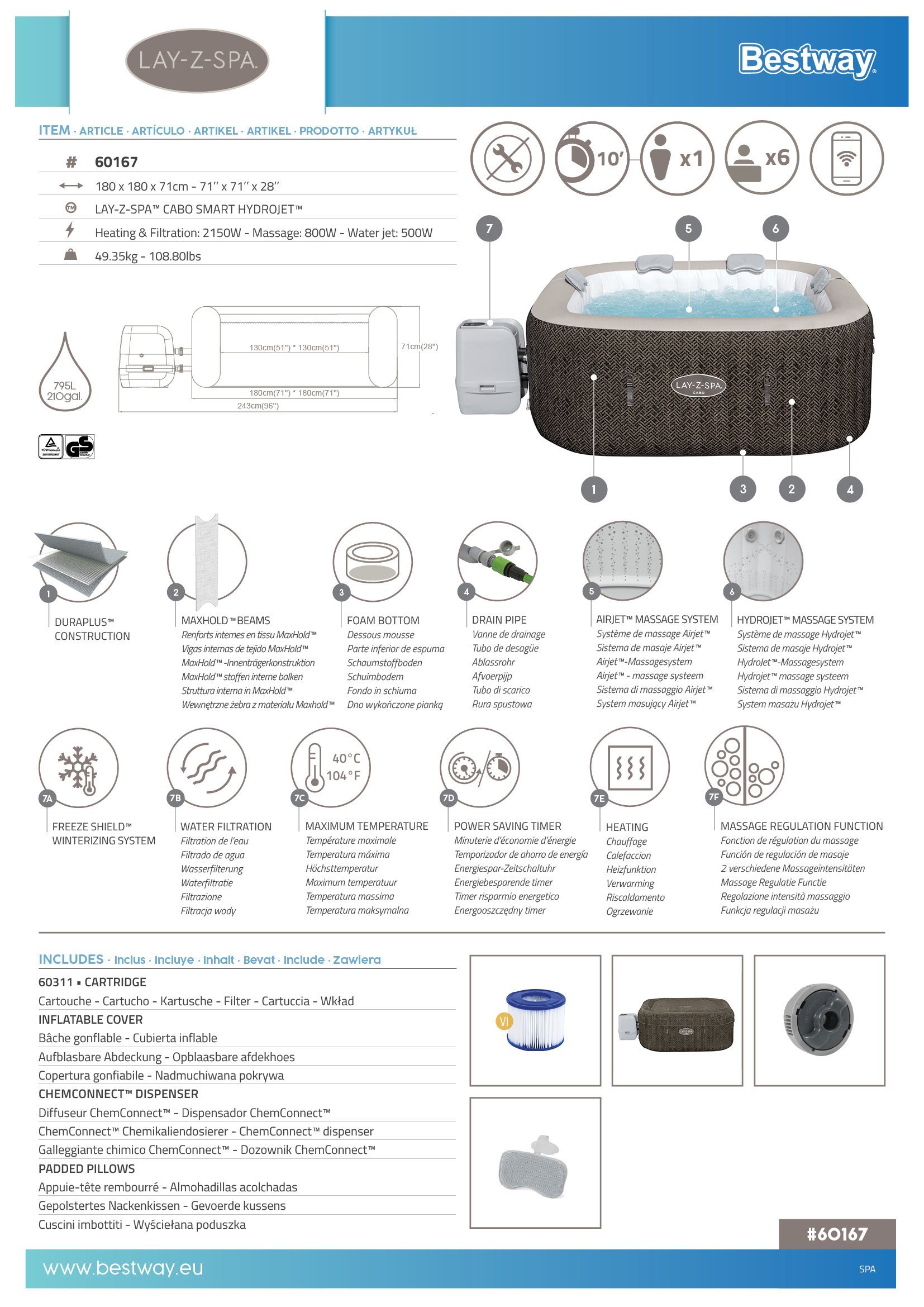 Lay-Z-Spa® 60167 Cabo Smart HydroJet™ Şişme Spa Havuzu, Mobil Uygulama Kontrollü, 4-6 kişilik 180 X 180 X 71 cm