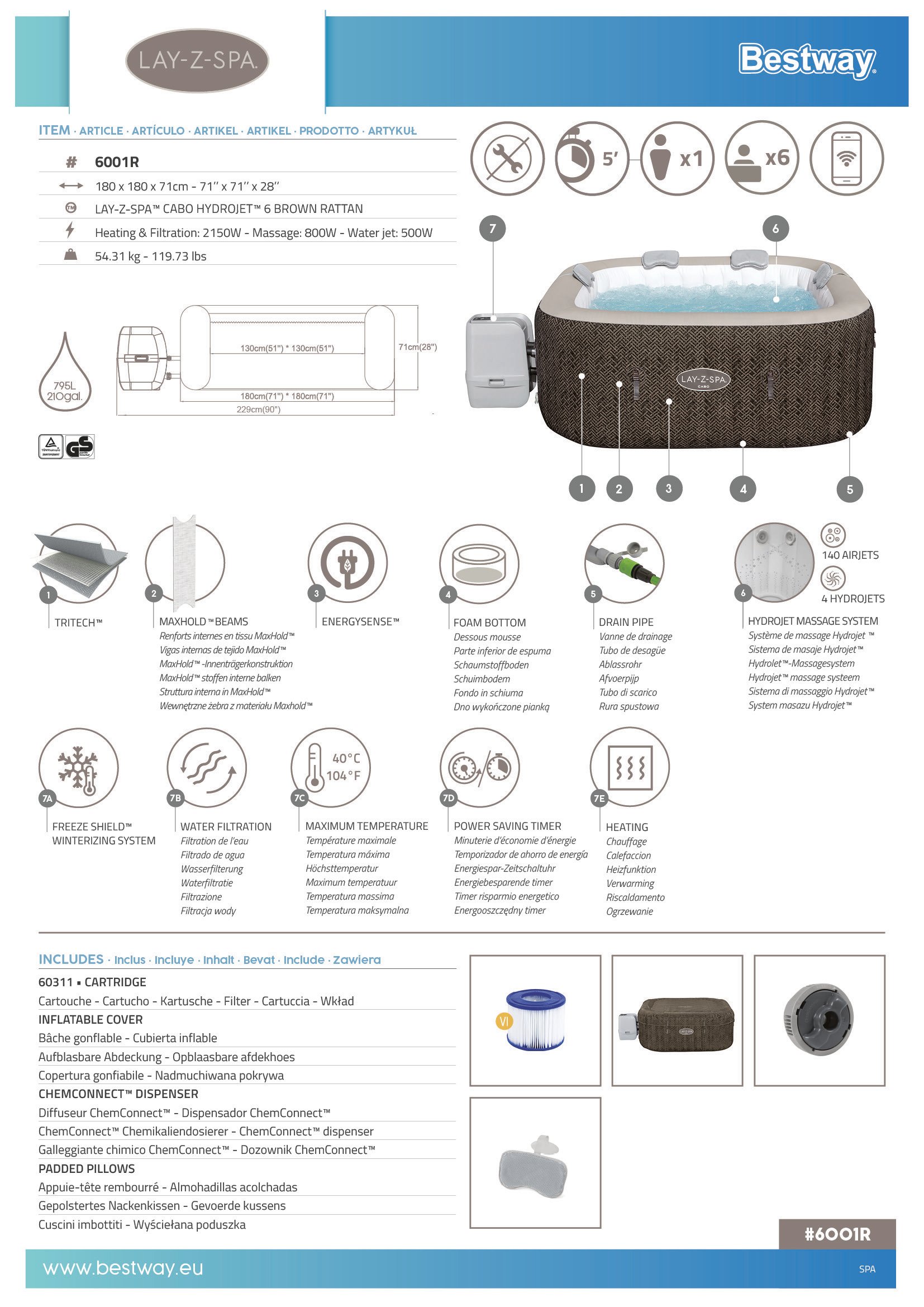 Lay-Z-Spa® Cabo Smart HydroJet™ 6001R Enerji Tasarruflu Şişme Spa Havuzu, Mobil Uygulama Kontrollü, 4-6 kişilik 180 X 180 X 71 cm
