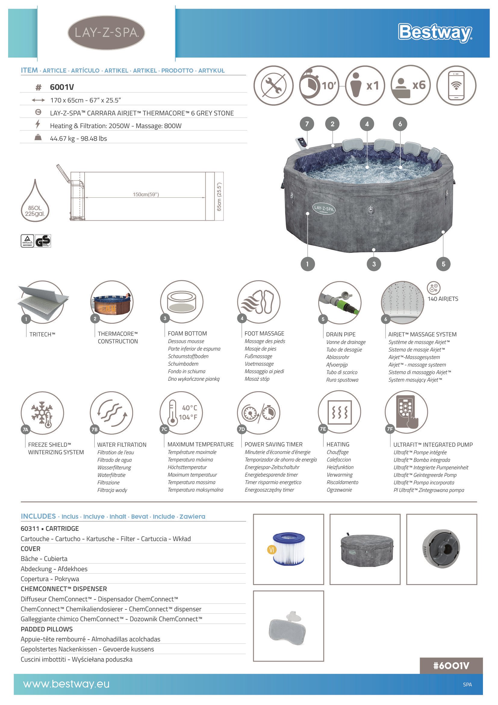 Lay-Z-Spa® Carrara Smart AirJet™ 6001V Enerji Tasarruflu Şişme Spa Havuzu, Mobil Uygulama Kontrollü, 4-6 kişilik 170 X 65 cm